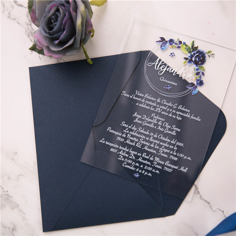 Note: There is a protective film on the acrylic invitations, you can easily peel it off by dropping some water on the film.