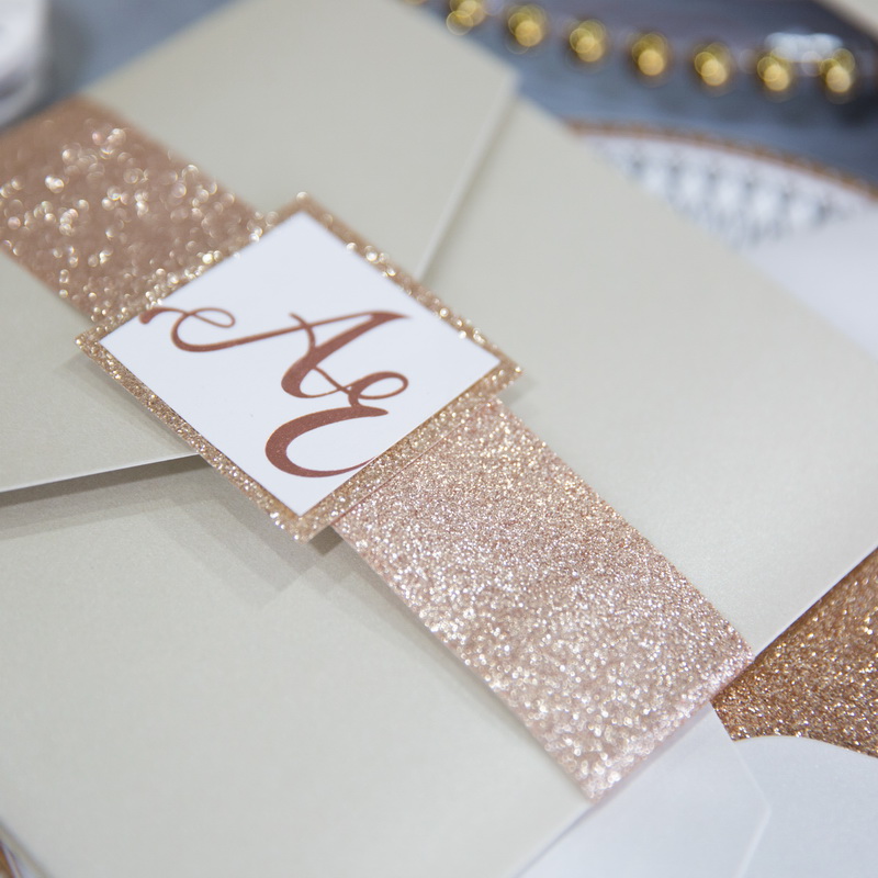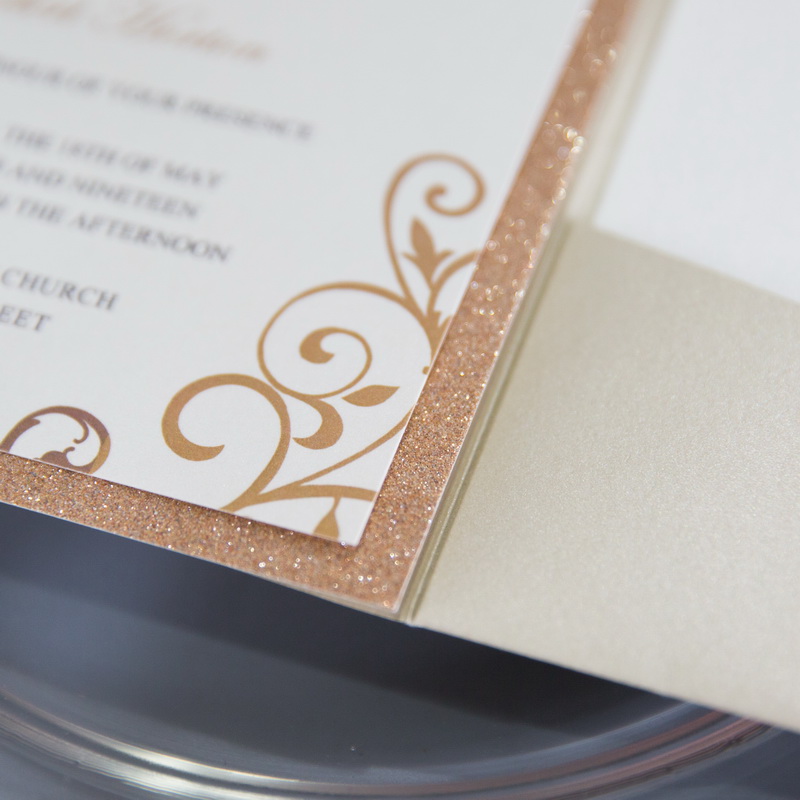 Our newest and most popular wedding invitation! This invitation is laser printed and with a fancy pocket for the main invitation card. Purchase 200 or more cards to have the price of your color change waived.