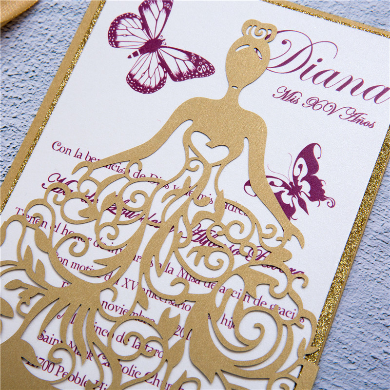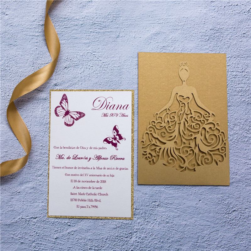 Our newest and most popular wedding invitation! This invitation is laser printed and with a fancy pocket for the main invitation card. Purchase 200 or more cards to have the price of your color change waived.
