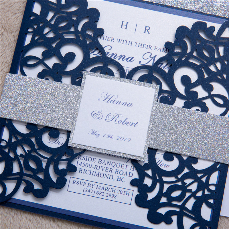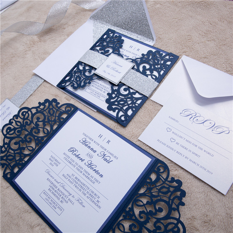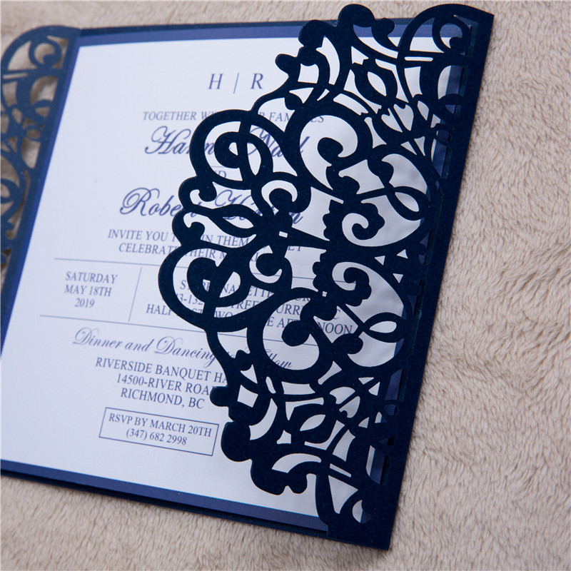 Our newest and most popular wedding invitation! This invitation is laser printed and with a fancy pocket for the main invitation card. Purchase 200 or more cards to have the price of your color change waived.