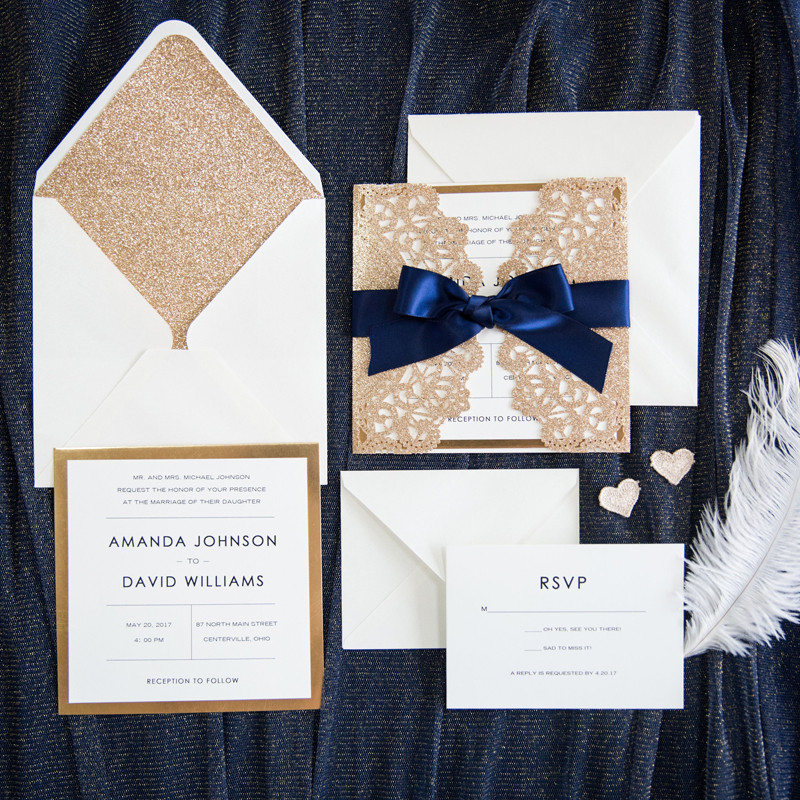 Rustic Lace Glitter Paper Laser Cut Wedding Invitation Cards