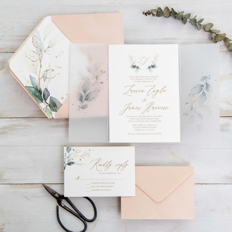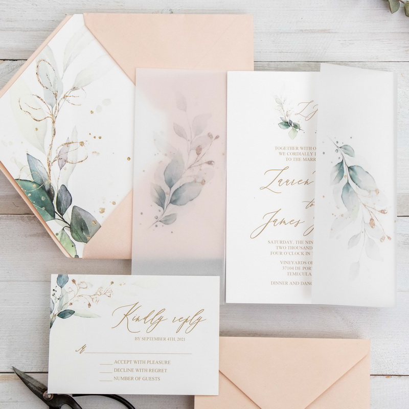 Vellum weding invitations have a soft and elegant design that is sure to impress your guests. Vellum wedding invitations are very popular. Start customizing your wedding invitations below!